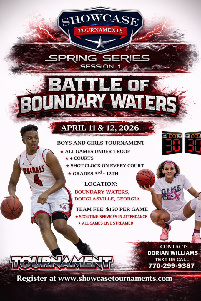 Welcome to Showcase Tournaments! We are proud to present the Showcase Tournaments Spring Basketball Series, which is being held at Boundary Waters in Douglasville, Georgia on April 11 – 12, 2026 . All games are under one roof as this is a beautiful 4 court facility. We host tournaments in the Atlanta area year-round.